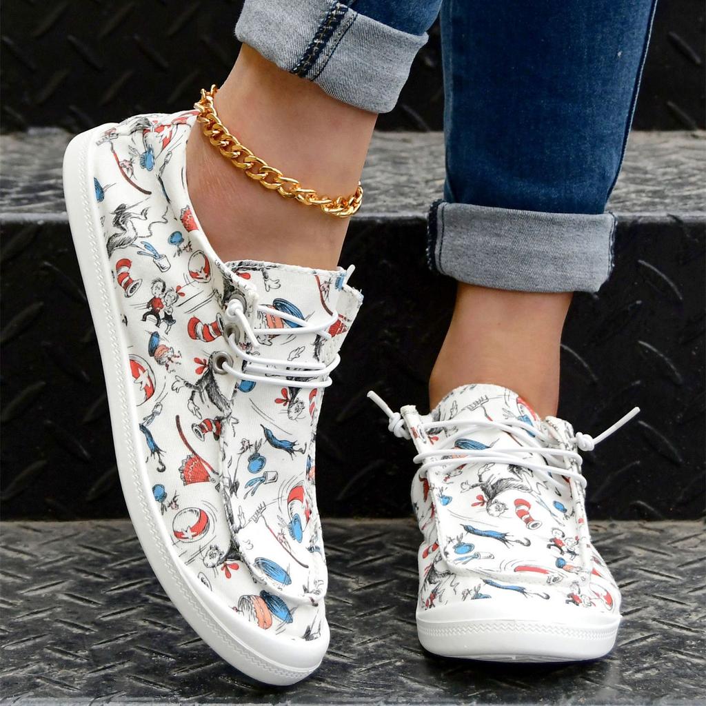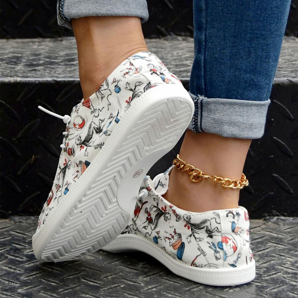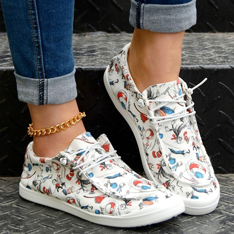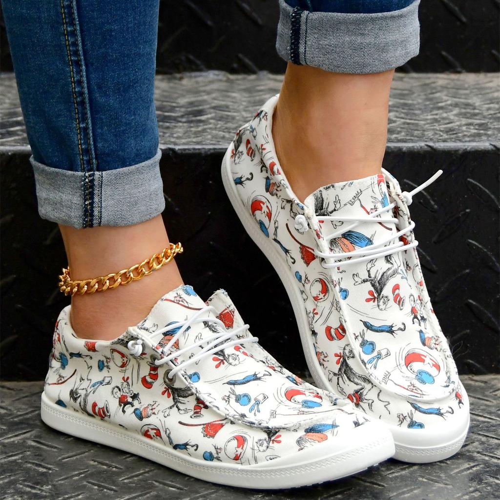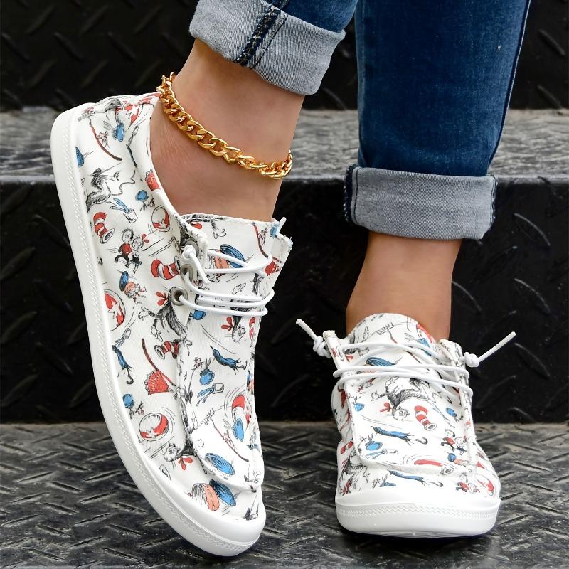 Женские лоферы на плоской подошве с мультяшным принтом, легкие, с круглым носком, удобные, на шнуровке, слипоны, парусиновая обувь, повседневная обувь с низким верхом