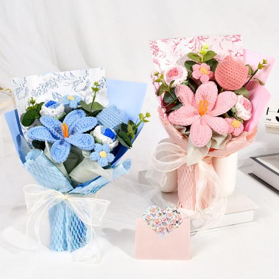 Долговечный символизм: В отличие от быстро увядающих свежих цветов, этот букет, связанный крючком, сохраняет свой первозданный вид неопределенно долго.. Он символизирует вечную любовь и привязанность, что делает его идеальным памятным подарком, сохраняющим значимые воспоминания на протяжении юбилеев и других дорогих праздников.