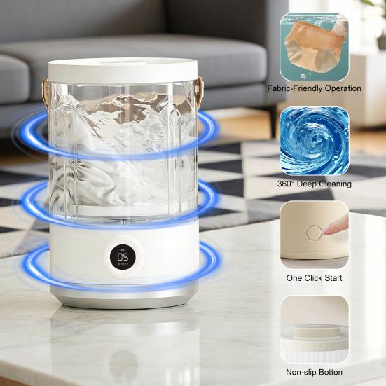 Портативная мини-стиральная машина для деликатных вещей: Эта мини-машина, специально разработанная для гигиеничной индивидуальной стирки, идеально подходит для нижнего белья, носков, детской одежды и других деликатных вещей.. Его компактная форма подходит для различных помещений, включая дома, квартиры, общежития, автодома и гостиницы.. Сохраняйте свое интимное белье свежим и безупречным с помощью устройства, специально разработанного для эффективной обработки деликатных потребностей при стирке.