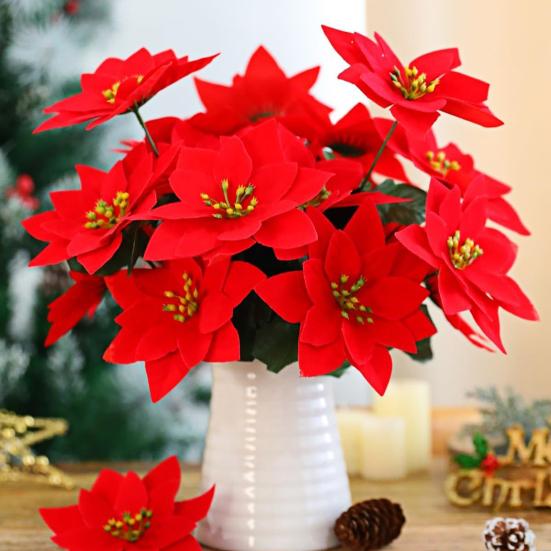 Универсальные варианты размеров для любого пространства: Доступная в конфигурациях с 5 и 7 головками, эта искусственная пуансеттия легко адаптируется к различным потребностям декора.. Будь то использование в качестве центрального элемента на обеденных столах или включение в более крупные цветочные композиции, эти варианты размеров предлагают гибкий стиль, дополняющий как маленькие, так и просторные помещения.