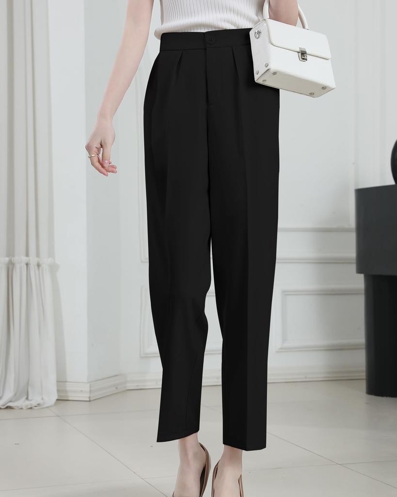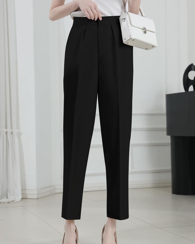The trendy elastic waist design makes these pants suitable for all body types. They gently cover the thighs and hips, and the center crease accentuates the vertical lines, making your legs look longer and slimmer. The simple design combines a neat look with a stylish, flattering silhouette. These pants pair perfectly with both elegant blouses and simple tops, bringing out your sophisticated femininity.