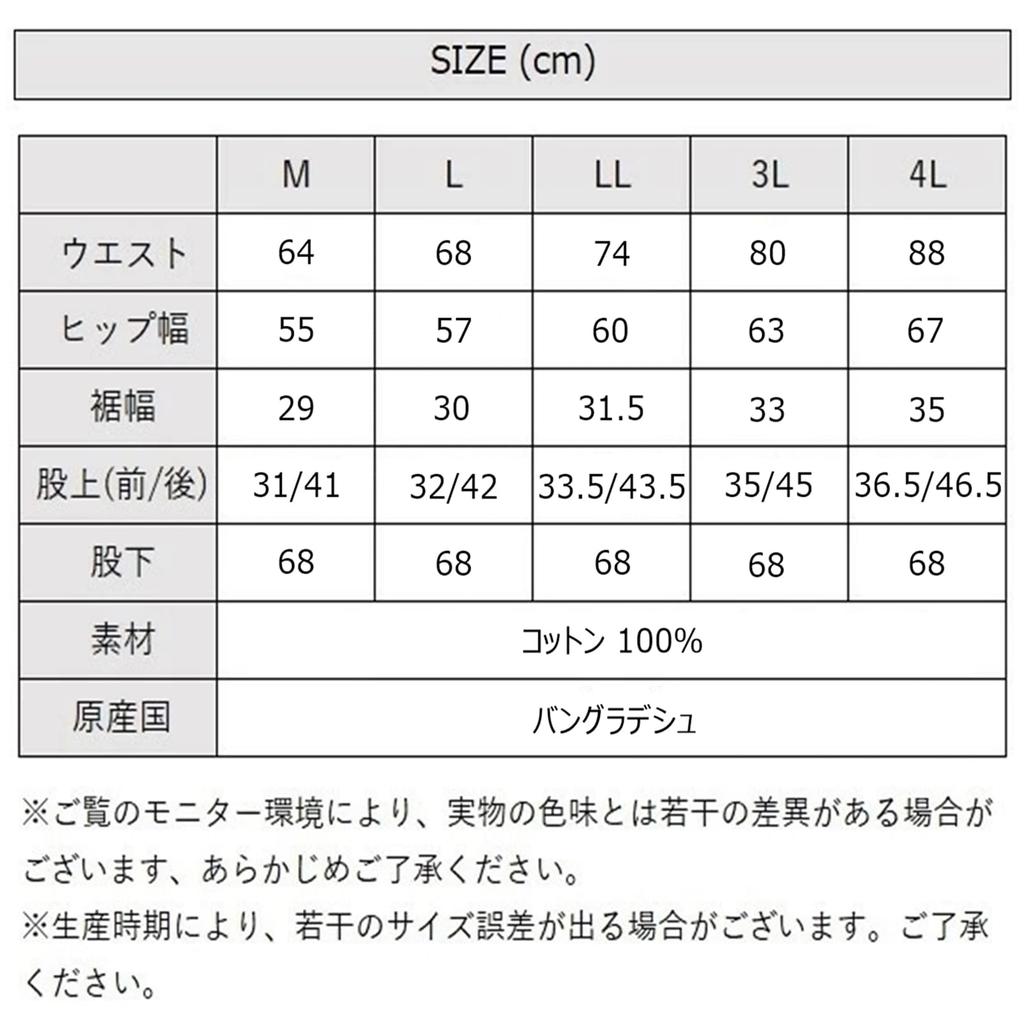 cm, Hip Width: 60cm, Rise (Front/Back): 33.5/43.5cm, Inseam: 68cm, Hem Width: 31.5cm [Size 3L] Waist: 80cm, Hip Width: 63cm, Rise (Front/Back): 35/45cm, Inseam: 68cm, Hem Width: 33cm [Size 4L] Waist: 88cm, Hip Width: 67cm, Rise (Front/Back): 36.5/46.5cm, Inseam: 68cm, Hem Width: 35cm [Material] 100% Cotton [Lining] None [Transparency] None [Stretch] None [Thickness] Slightly thin [Country of Origin] Bangladesh *All measurements are taken flat. There may be slight variations in size. Thank you for your understanding. *The actual color may differ slightly depending on your monitor settings. Thank you for your understanding.