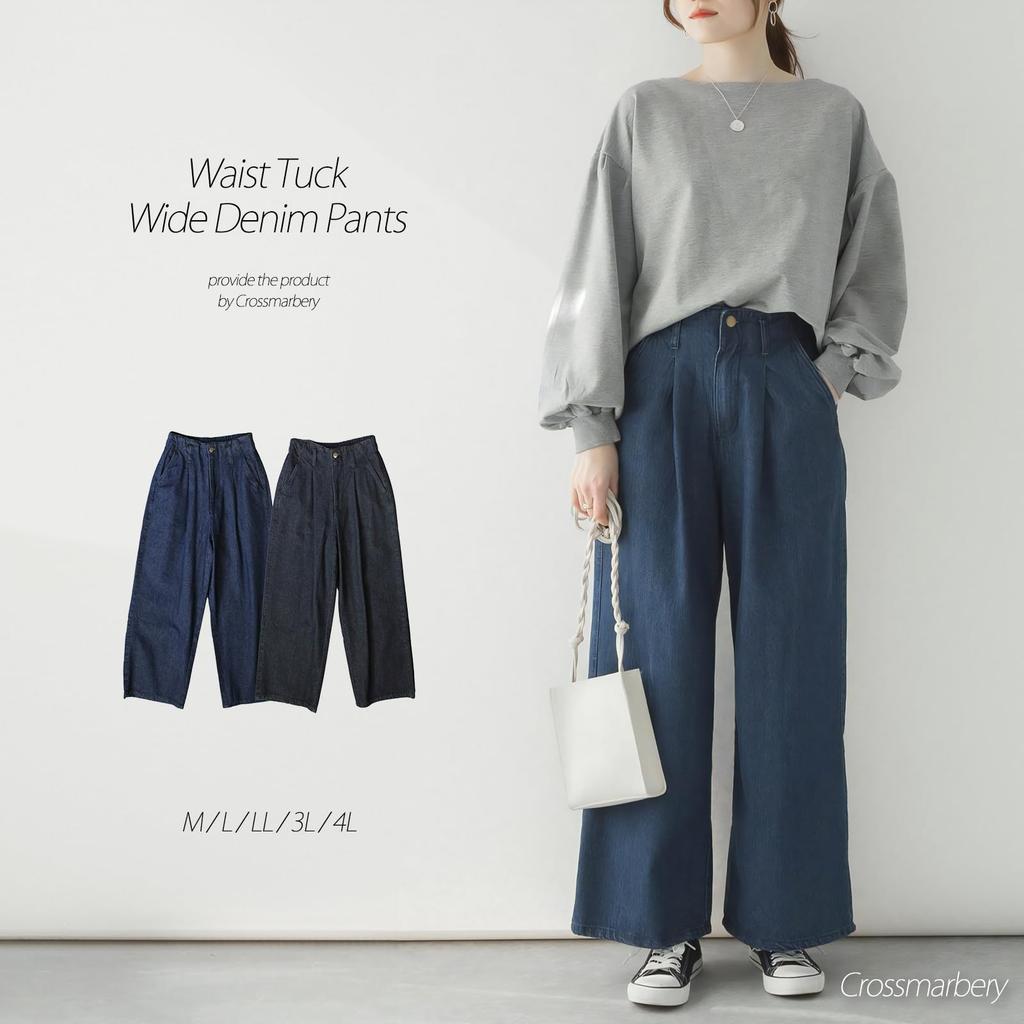 ◆ Wide-leg denim pants with a slimming silhouette, a relaxed fit, and comfortable elastic waistband for beautiful legs. Stylish and sophisticated, these jeans are available in sizes M-4L. ◆ These denim pants feature a high waist for a flattering silhouette, flattering your feet. They maintain a beautiful silhouette from the front, side, and back. The wide yet streamlined silhouette, with waist tucks on both sides creating a shading effect, creates a slimming effect around the waist. The comfortable elastic waistband ensures a comfortable fit without restricting your style. These denim pants are perfect for year-round wear. They're a versatile piece that can be coordinated with any outfit, regardless of the season. The moderately thick denim fabric makes them a classic material for all seasons. Enjoy fashionable styles throughout the year. ◆Size [M size] Waist: 64cm, Hip width: 55cm, Rise (front/back): 31/41cm, Inseam: 68cm, Hem width: 29cm [L size] Waist: 68cm, Hip width: 57cm, Rise (front/back): 32/42cm, Inseam: 68cm, Hem width: 30cm [LL size] Waist: 74
