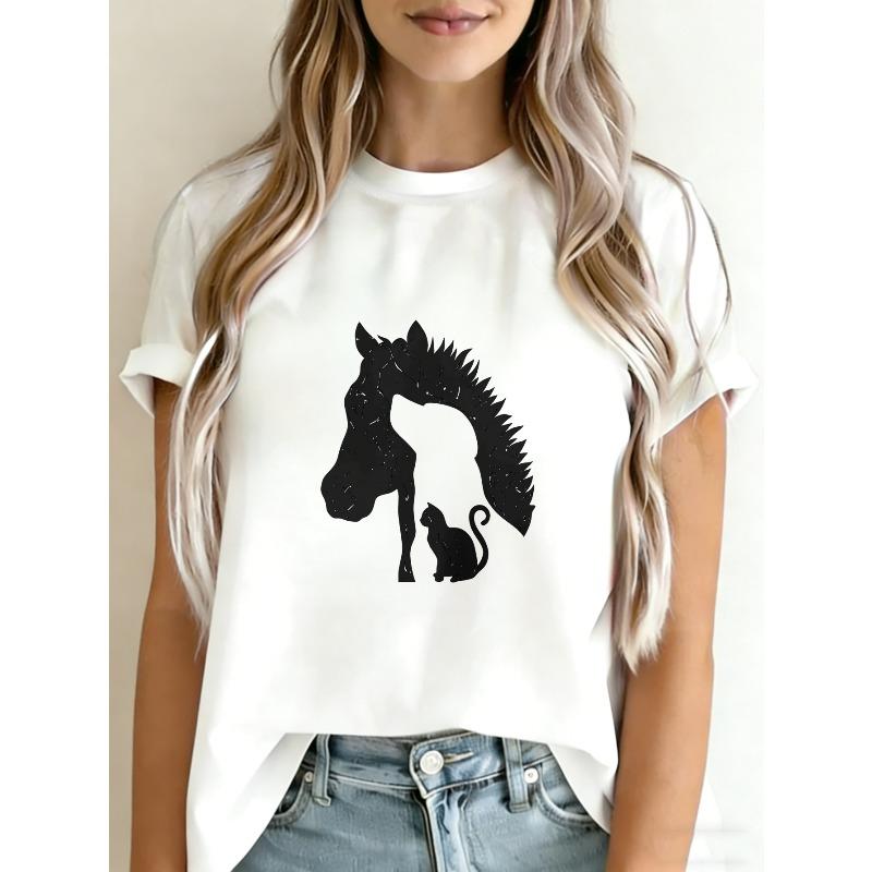 Женская повседневная футболка с коротким рукавом, белая, с принтом силуэта лошади и кошки, летний топ для повседневной носки