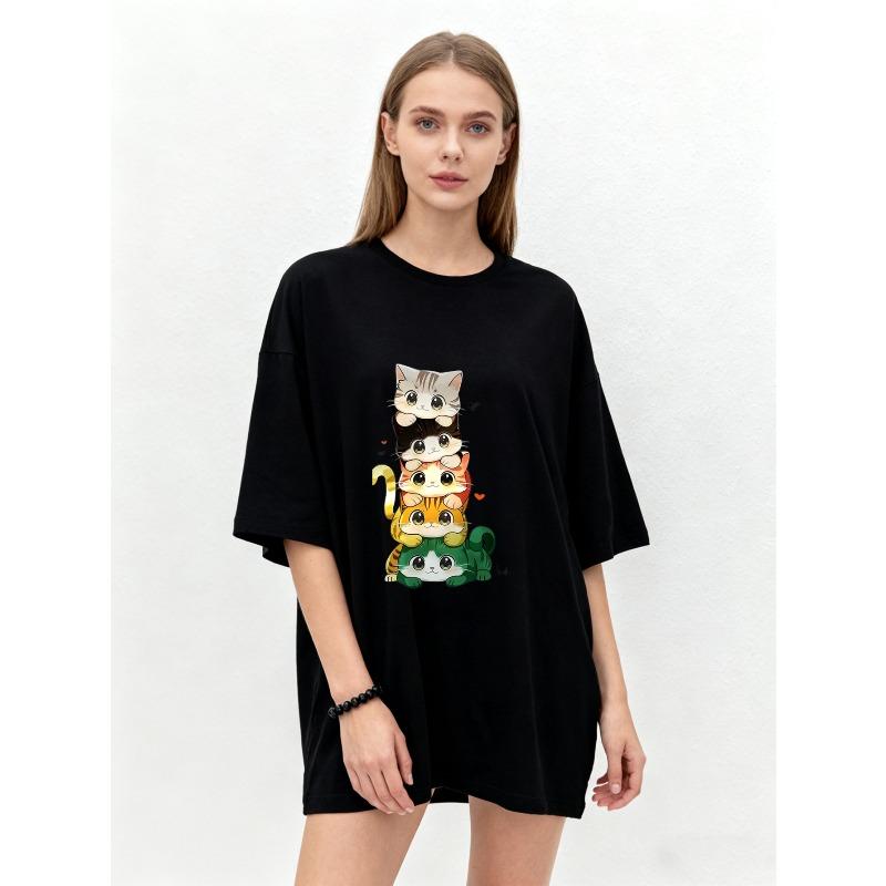 Футболка оверсайз черная с милым принтом стопки кошек, повседневная одежда для женщин, летняя мода, уличная одежда, графическая футболка