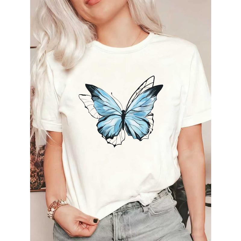 Oversized T-Shirt Black Blue Butterfly Print Casual Wear — купить товар онлайн с бесплатной доставкой по всему миру!