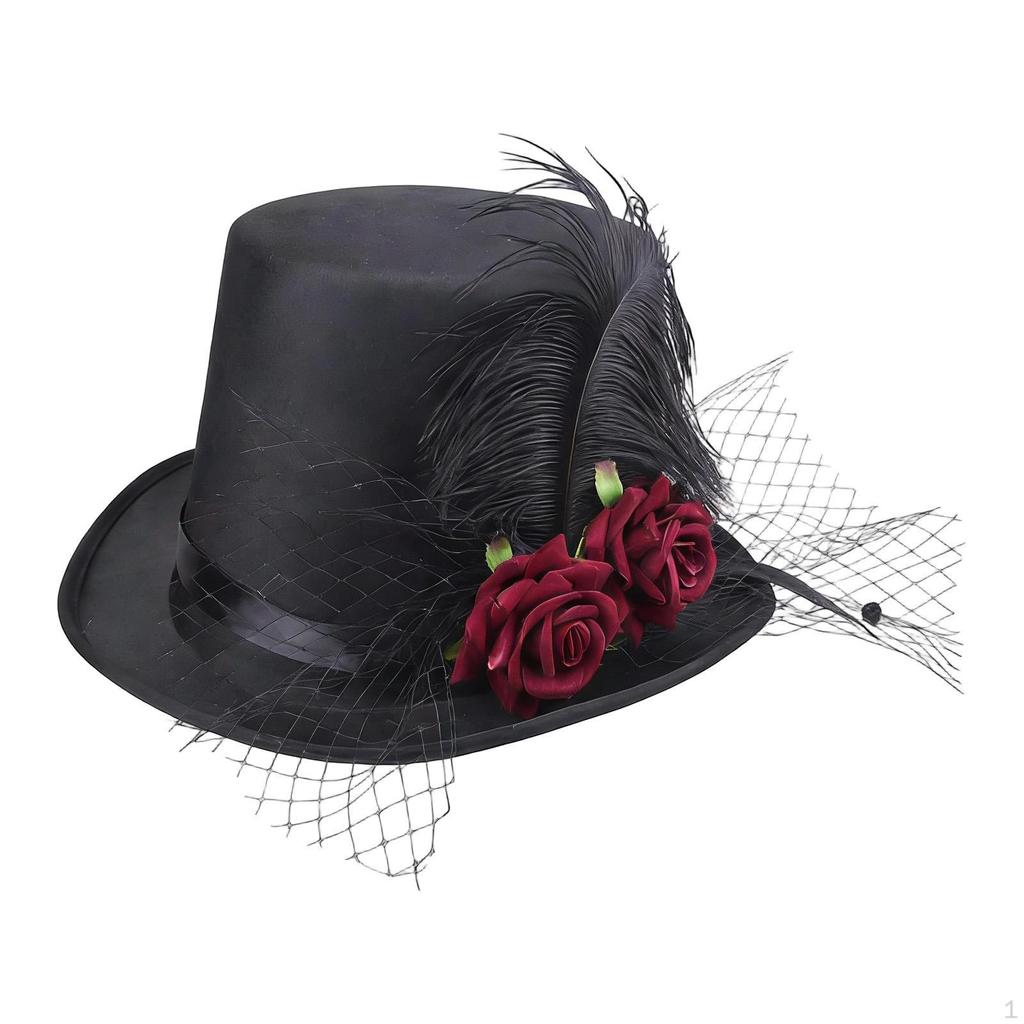- 【Элегантный дизайн】: Цилиндр имеет классический силуэт в викторианском стиле с широкими полями, украшенный кружевной сеткой, искусственными розами и искусственными перьями для изысканного праздничного образа.
