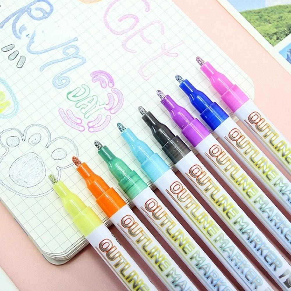 Metallic Double Line Outline Markers:Ideal for a wide range of creative applications, including letter writing, greeting cards, scrapbooking, handicrafts, posters, illustrations, and note-taking. Designed for versatility, these markers perform well on nearly all surfaces, such as metal, pottery, wood, rubber, glass, plastic, and stone.