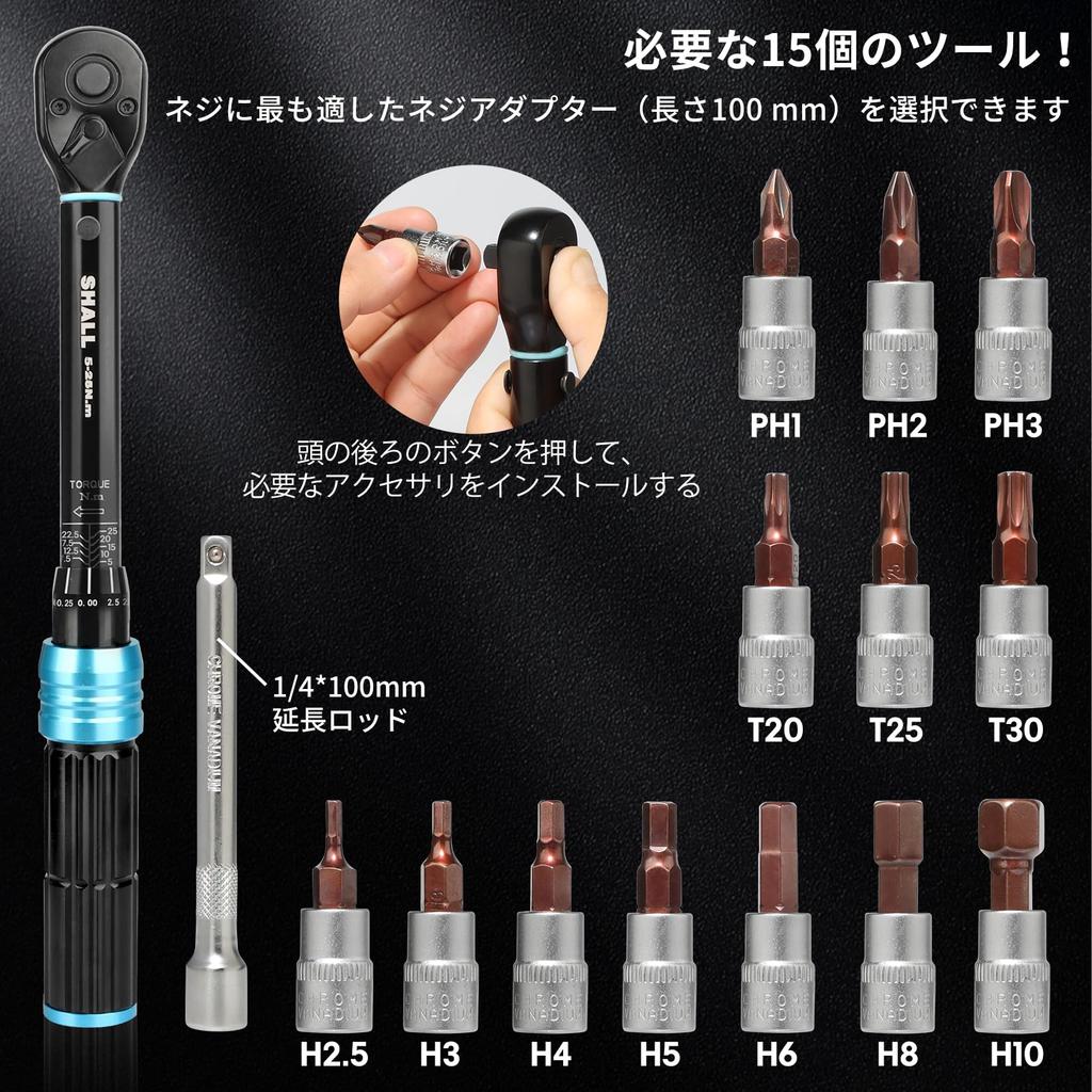 SHALL inch Torque Wrench Set Set with 14 Accessories 100mm Extension For and Cars 1/4 5-25N·m 15-Piece (H2.5, H3, H4, H5, H6, H8, H10, PH1, PH2, PH3,