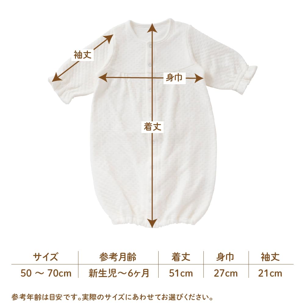 [Размеры] 50-70см: Длина 51см, ширина груди 27см, длина рукава 21см. (Для младенцев от рождения до примерно 6 месяцев) [Хорошо растет] Можно носить долго, с рождения примерно до 6 месяцев.. Идеально для домашнего использования, а также в качестве подарков на день рождения, подарков на baby shower и подарков при выписке из больницы.. *Период ношения является приблизительным. [Двусторонний с застежками-кнопками в паховой области] Платье можно использовать как цилиндрическое платье для новорожденных и как раздельный комбинезон для более активных младенцев. [Материалы] Футбольный трикотаж: 100% хлопок, Джерси: 100% хлопок, Гладкий хлопок 100%, Вязаное стеганое одеяло: 100% хлопок (Заполнение: 100% полиэстер) [Надежное Сделано в Японии] Сделано в Японии с надежным качеством от ткани до отделки. С момента нашего основания в 1959 году как производителя, специализирующегося на детской одежде, мы привержены собственному производству, чтобы обеспечить безопасность, надежность и высокое качество детской одежды, и мы тщательно шьем каждое изделие, от раскроя ткани до отделки, на нашей собственной фабрике в Осаке.