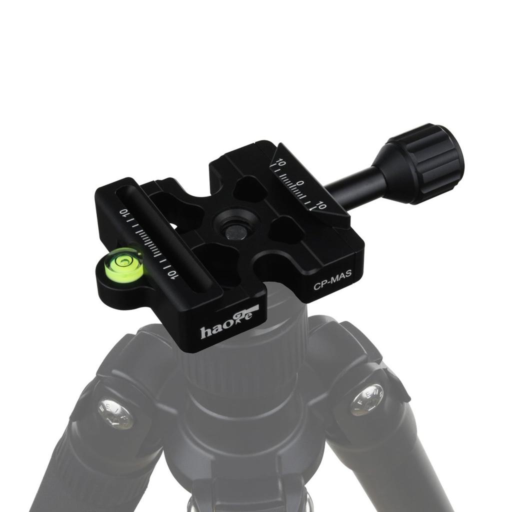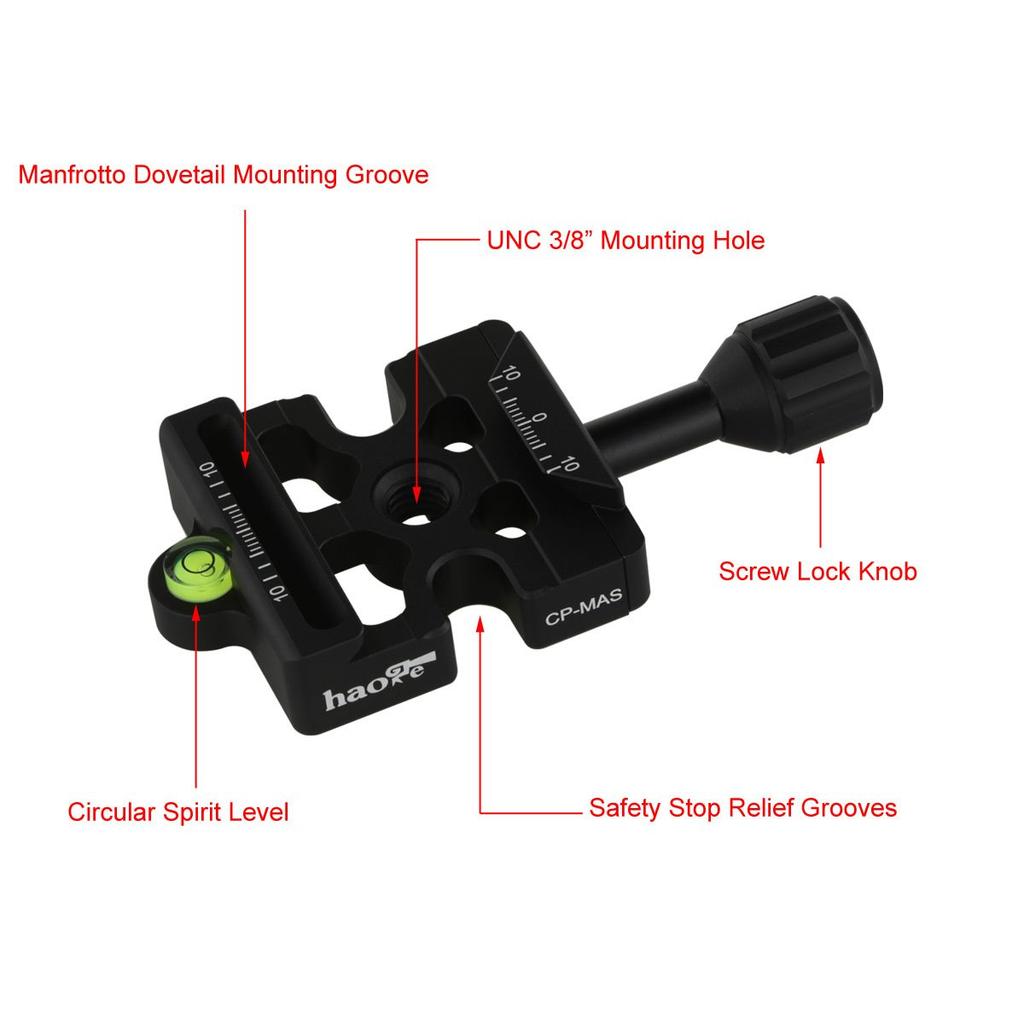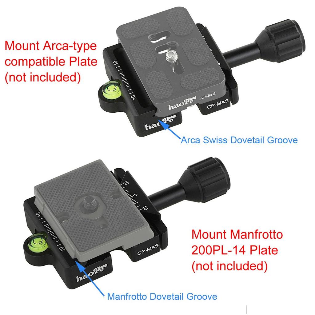 The Haoge clamp is an Arca Swiss and Manfrotto 200PL-14 RC2 compatible screw knob clamp.