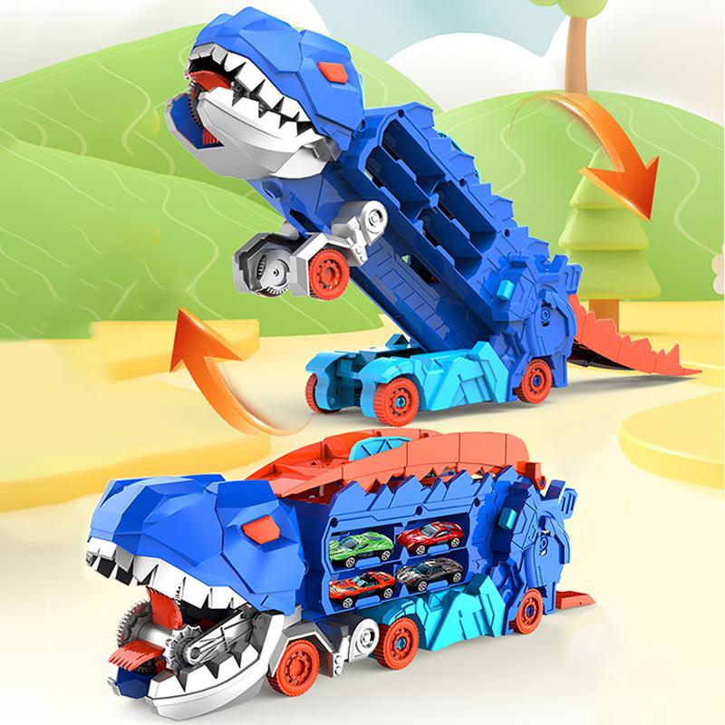 【Динозавр 3-в-1, трек для машинок и хранение машинок】Эта игрушка-грузовик-динозавр проглатывает машинки и превращается в крутого стоящего динозавра с 2 треками для скольжения машинок, и в игрушечном грузовике можно хранить более 16 металлических машинок.