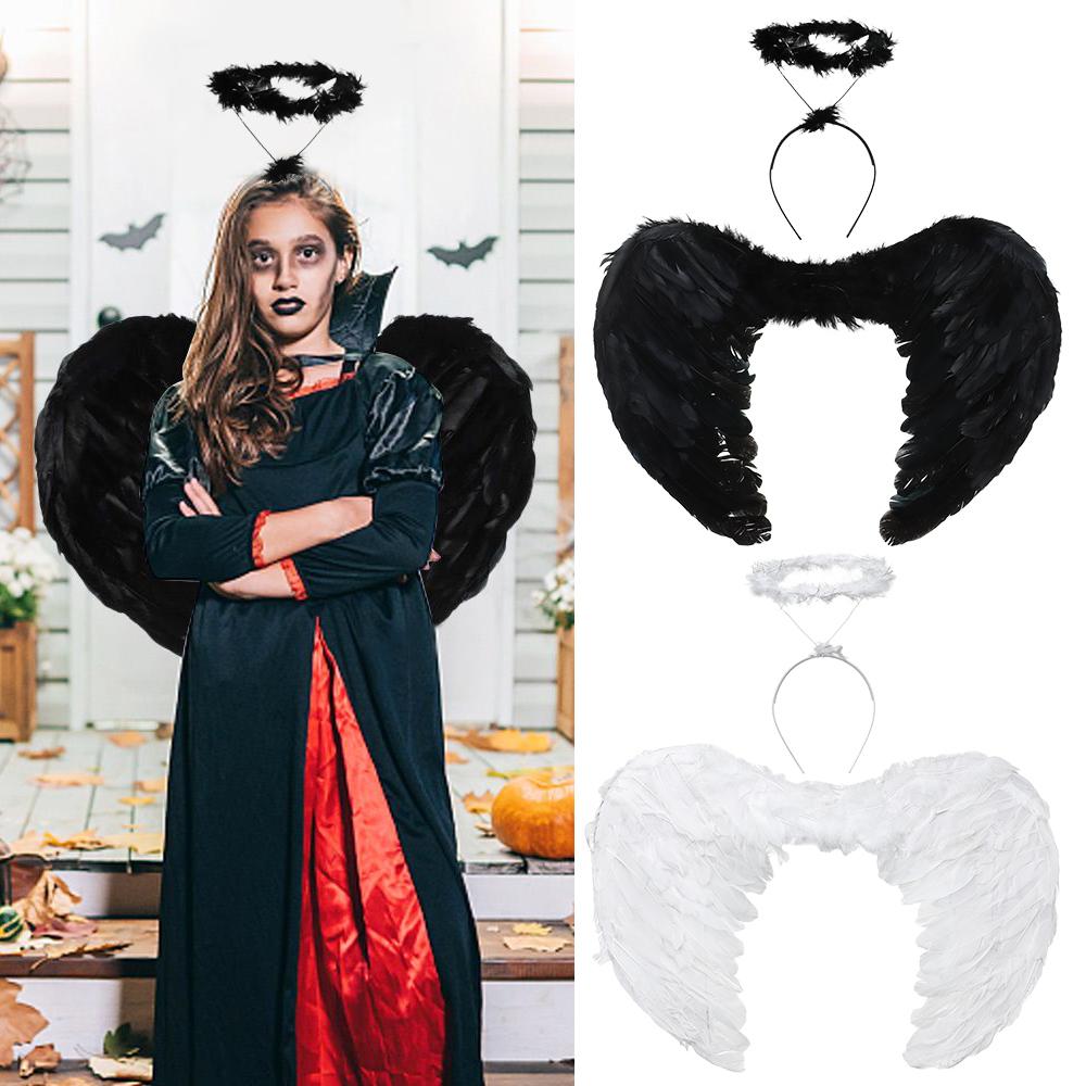 Мода Фея Косплей Хэллоуин Костюм Маскарадный Костюм Реквизит Крылья Ангела и Нимб Перьевые Крылья