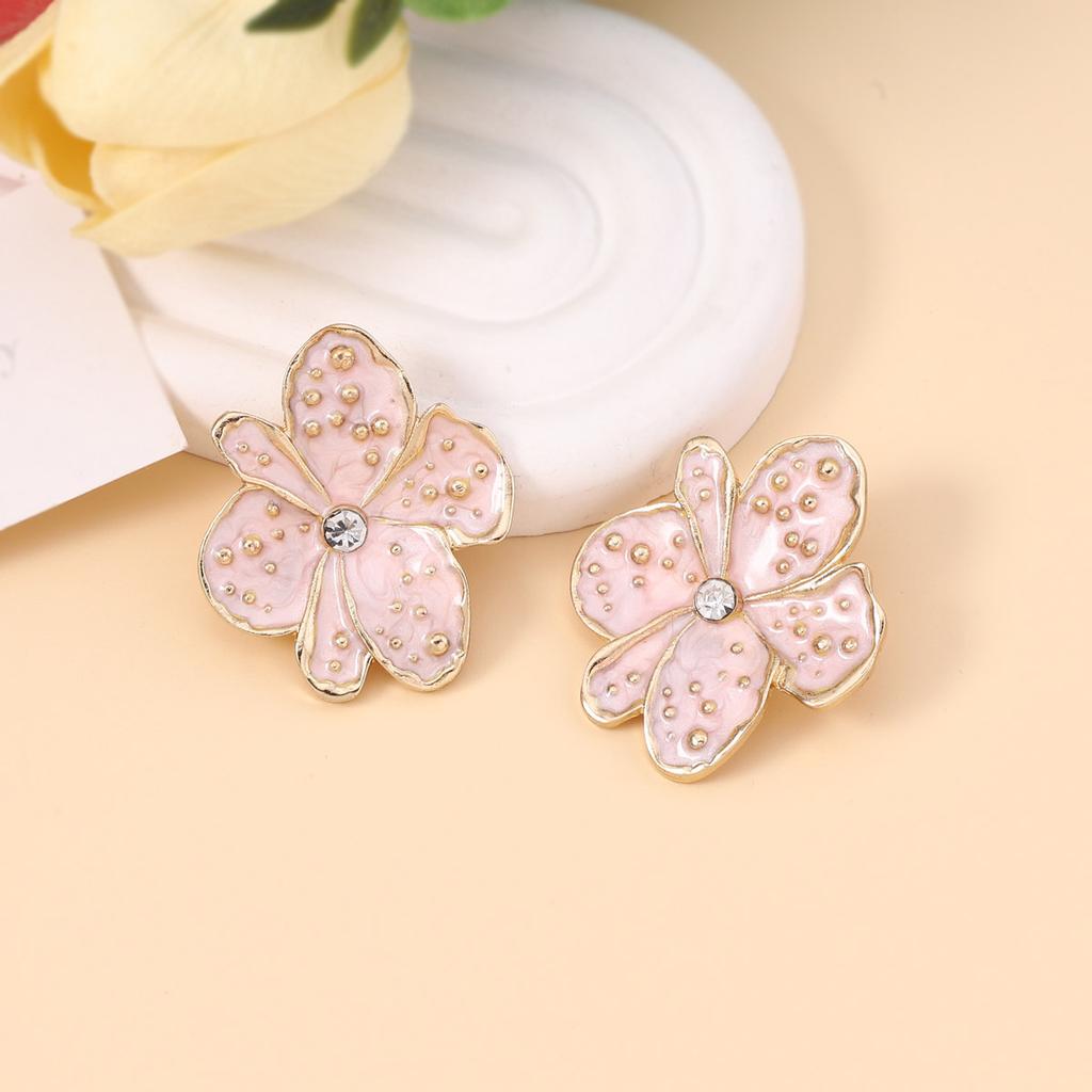 Korean version of simple niche drip oil alloy light pink flower temperament stud earrings, inlaid with zircon exquisite versatile earrings