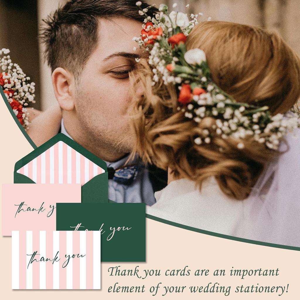 AZAZA Thank You Cards with Envelopes Striped 24 Pcs, Pink Thank You Cards Bulk Baby Shower Girl, Wedding Thank You Cards Green and Pink, Blank Thank
