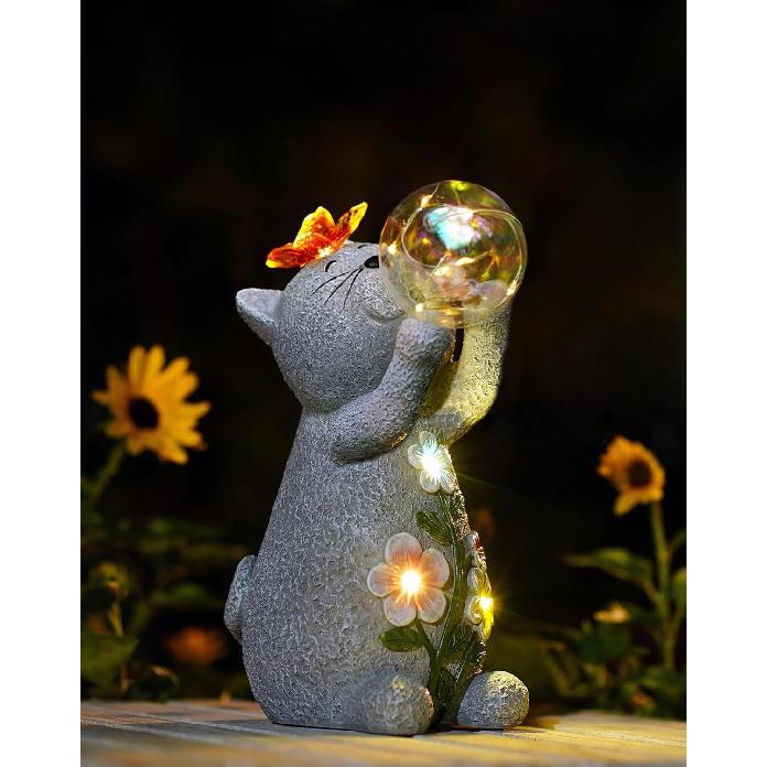 Goodeco Солнечная статуэтка кошки для сада - Уличное украшение кошка со светодиодной подсветкой-бабочкой и суккулентами для любителей кошек и садоводов - Идеальное