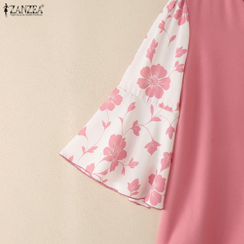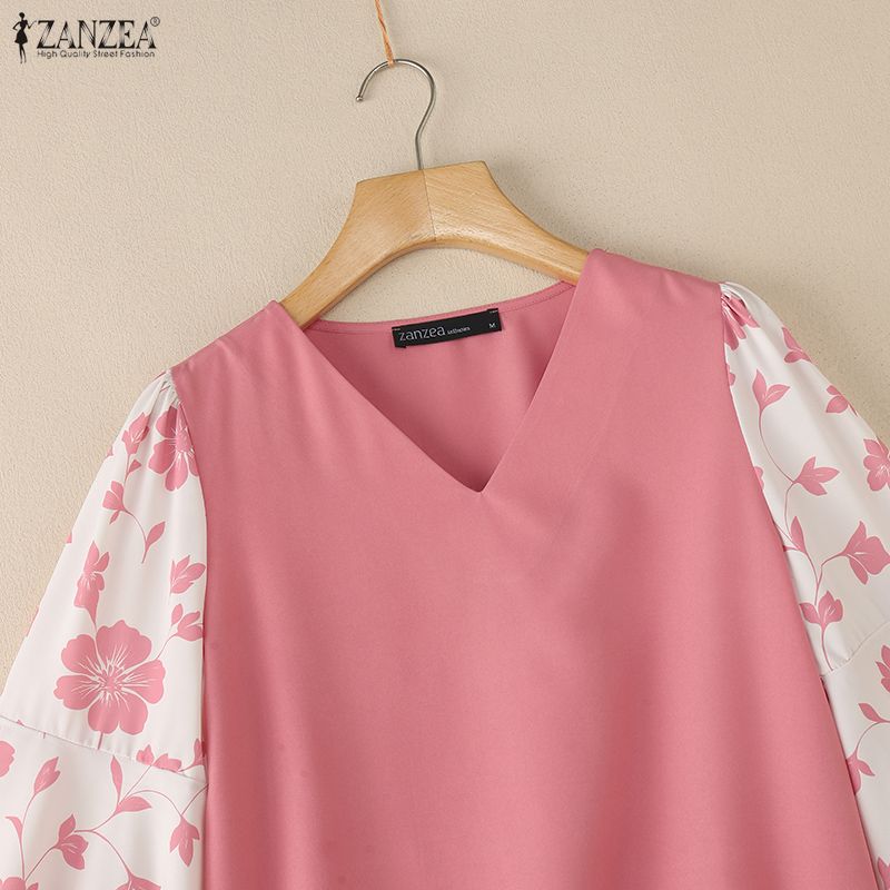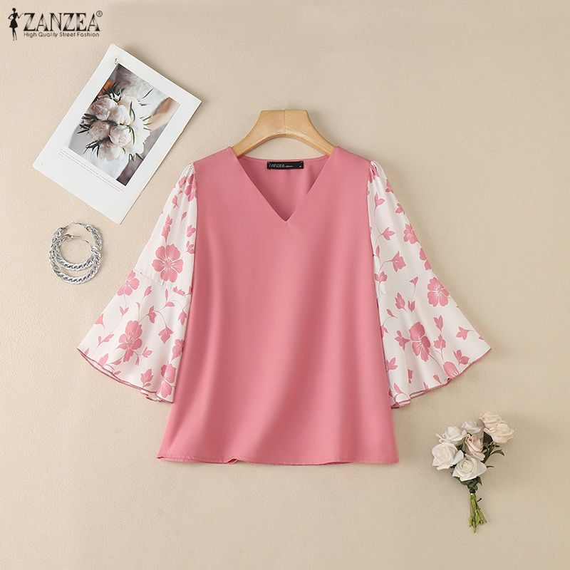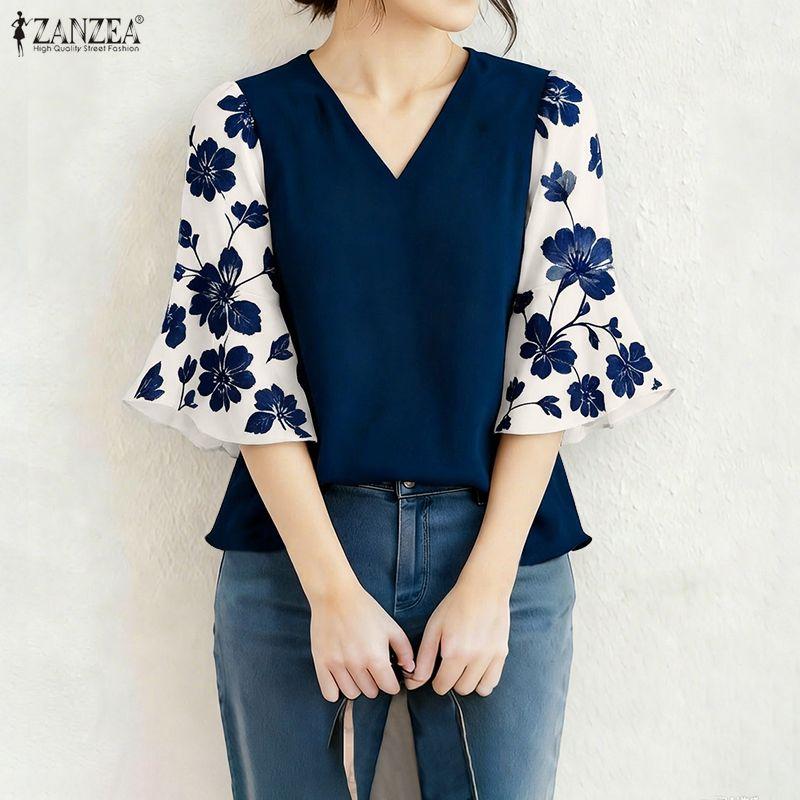 ZANZEA Женская повседневная блузка с V-образным вырезом, принтом и рукавами 3/4, свободного кроя