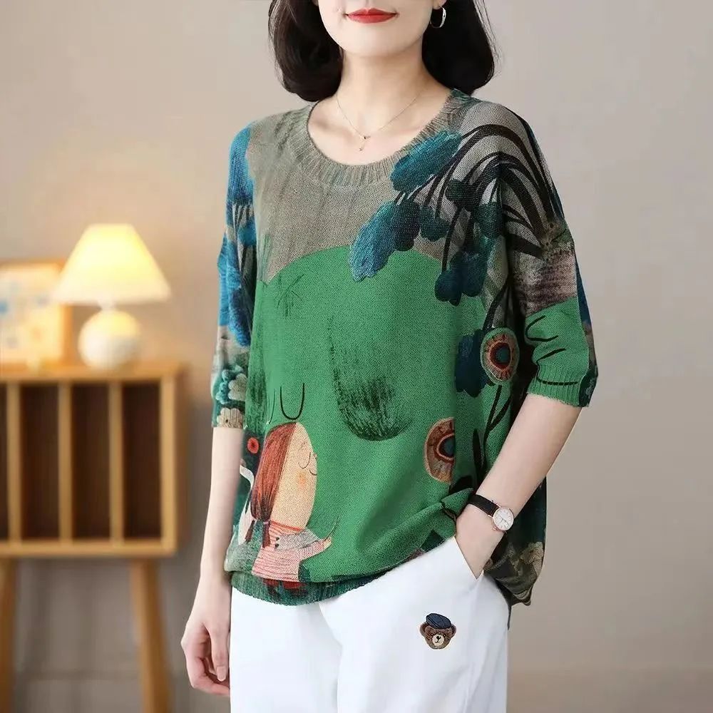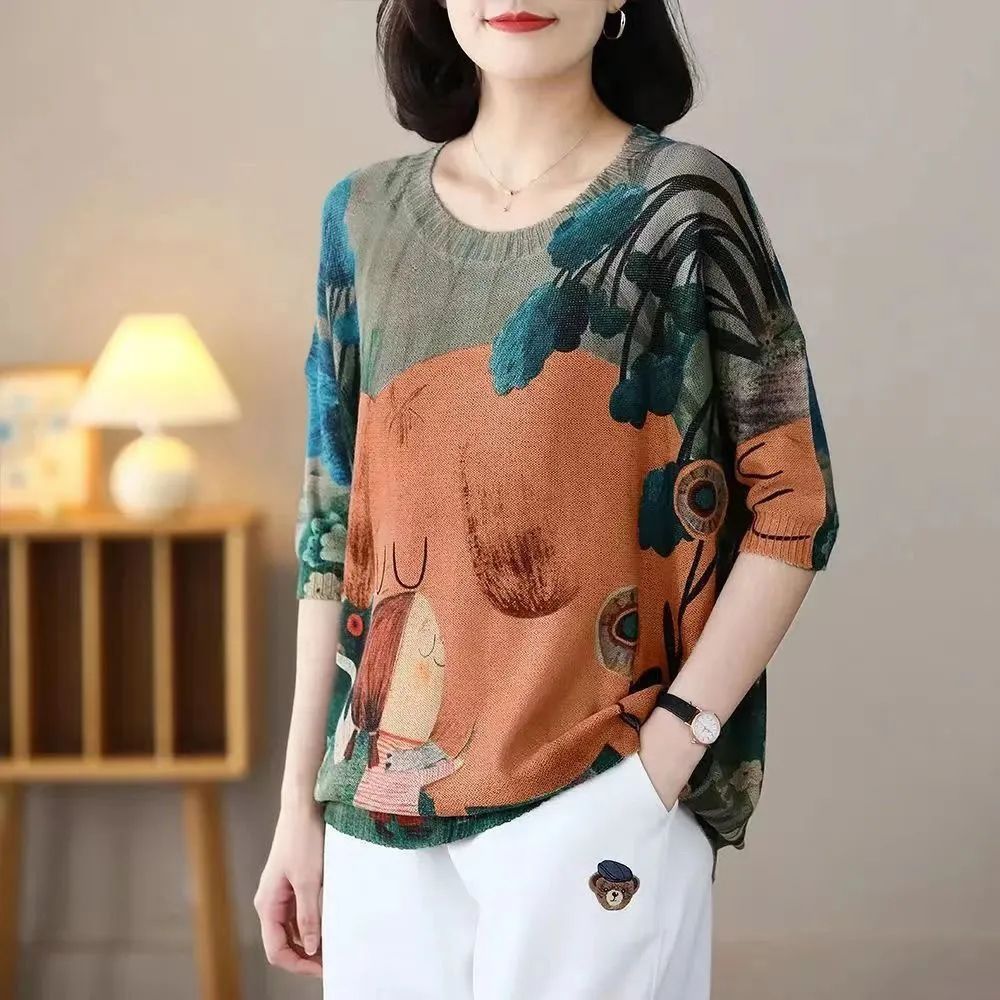 Harajuku Ретро женская летняя и осенняя модная одежда с винтажным цветочным принтом и круглым вырезом, вязаные свитера с короткими рукавами, женские свободные пуловеры