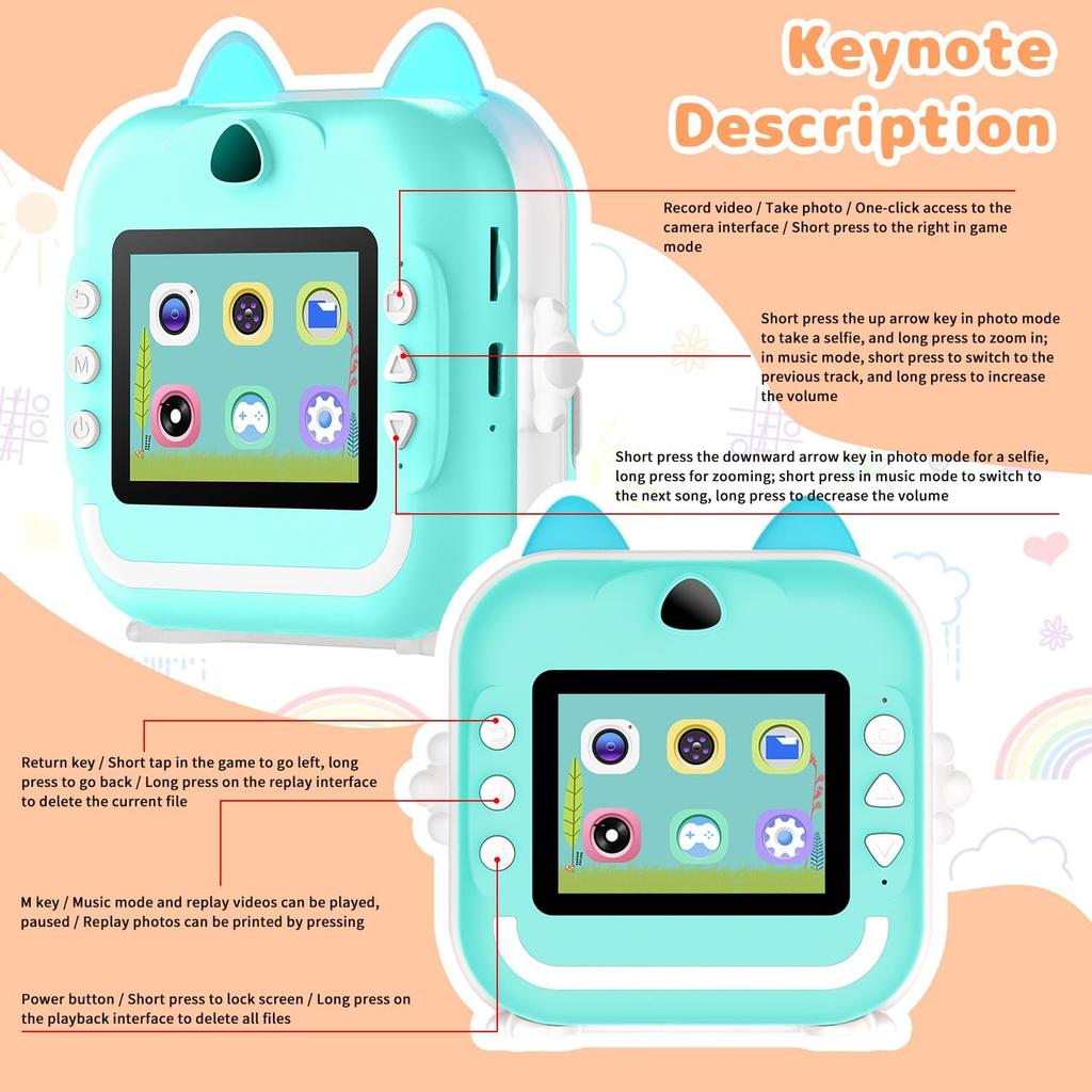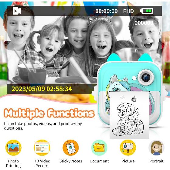📷【Multifunctional Kids Digital Camera】Our kids print camera has a 2.4-inch IPS screen and other features. Such as black and white instant printing, color photo shooting, 1080P video recording, 6x digital zoom, time-lapse photography, continuous shooting, games and mp3 playback and other functions. This is a good choice to accompany your children's happy growth and bring wonderful moments to you and your family.