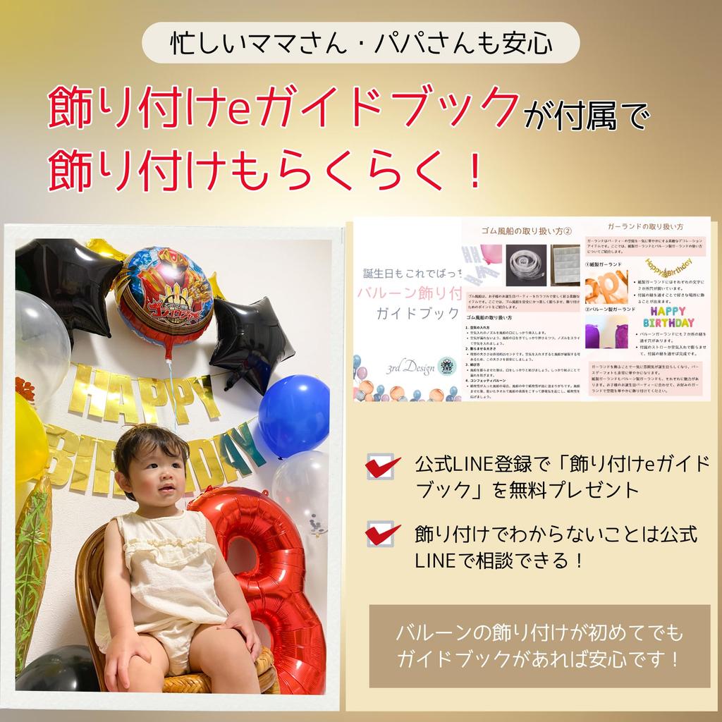 [Officially Licensed in Japan] Introducing a balloon set that faithfully recreates the power and charm of the Sentai heroes, "Number One Sentai Gojuger!" This luxurious set includes 13 items, including balloons featuring Gojuger's main visual, as well as swords, stars, garlands, number balloons, glittery chip balloons, and colored balloons. This set is perfect for birthdays and hero play, creating the ultimate hero birthday for boys. The bold colors of the Sentai, such as the gold garlands and black star balloons, are also appealing. It also comes with an e-guidebook for decorating, perfect for beginners!