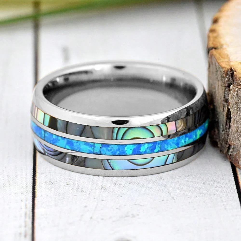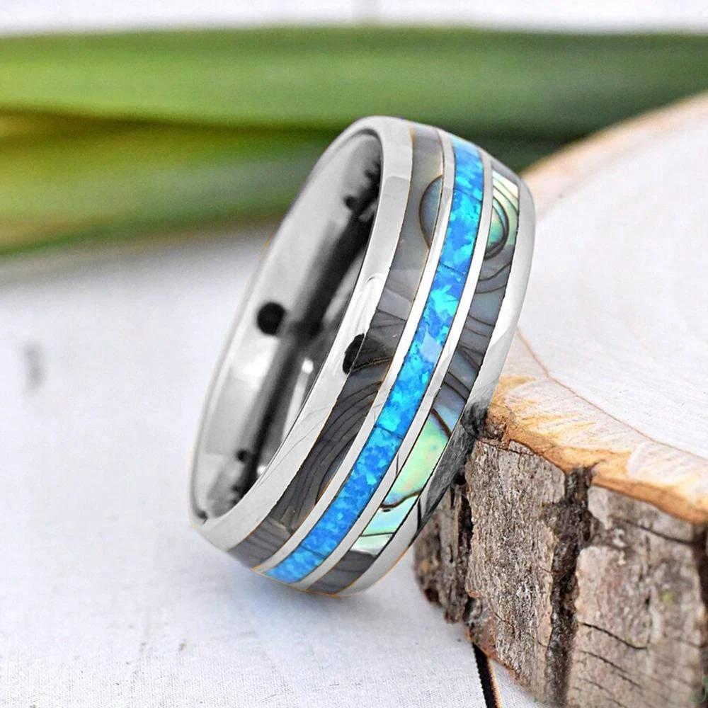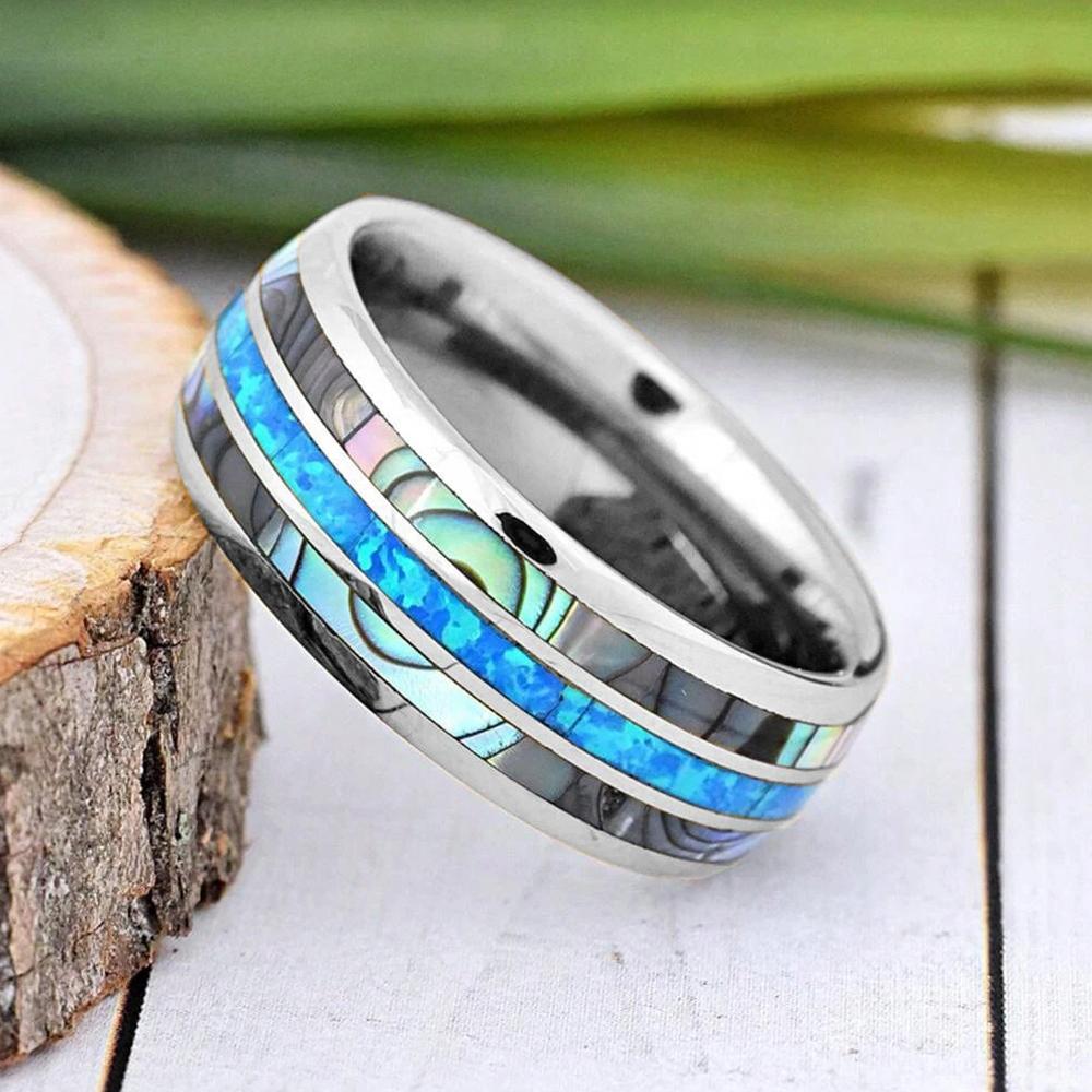 Мужские свадебные кольца из вольфрама серебристого цвета из нержавеющей стали с инкрустацией раковиной абалона и синим опалом, мужские свадебные украшения