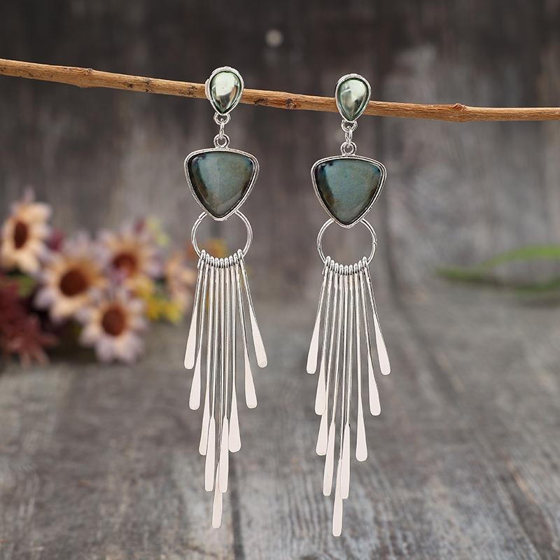 Винтажные треугольные серьги с инкрустацией белым камнем и кисточками, геометрические, креативные, серебристого цвета, серьги-подвески для женщин, ювелирные изделия