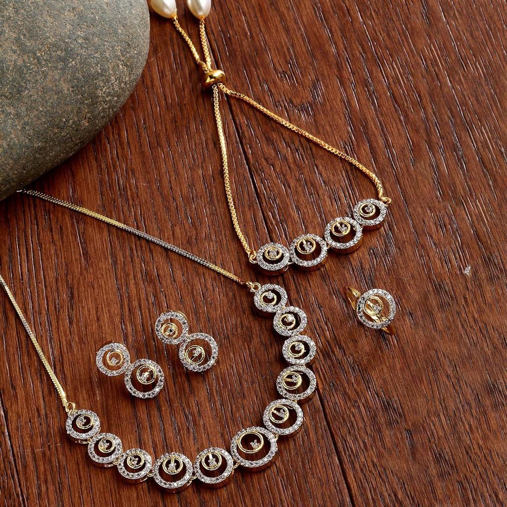 Что вы получаете:- Колье-чокер с кубическим цирконием 1N с золотым покрытием, кольцо 1N, браслет 1N с 2N (1 пара) Серьги