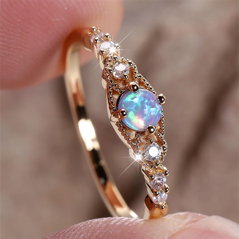 Синий Опал Маленький Круглый Камень Тонкие Обручальные Кольца Для Женщин Винтажный Золотой Цвет Белый Цирконий Обручальное Кольцо Камень Рождения Ювелирное Изделие Подарок