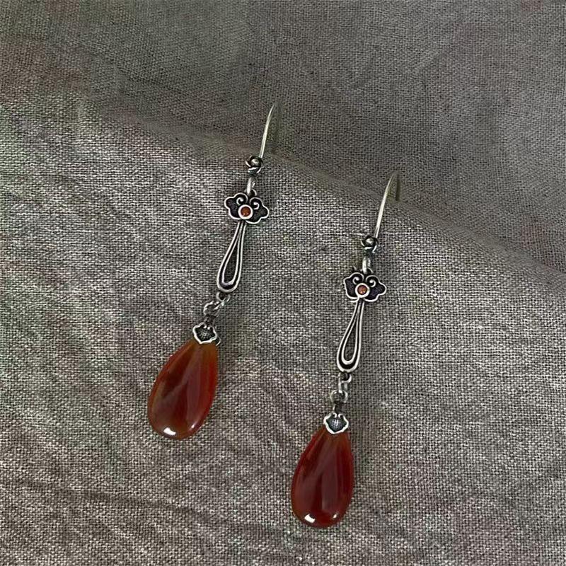 Винтажные серьги-подвески в форме капли воды с инкрустацией оранжево-красным камнем в виде цветка, геометрически креативные, серебристого цвета, женские украшения