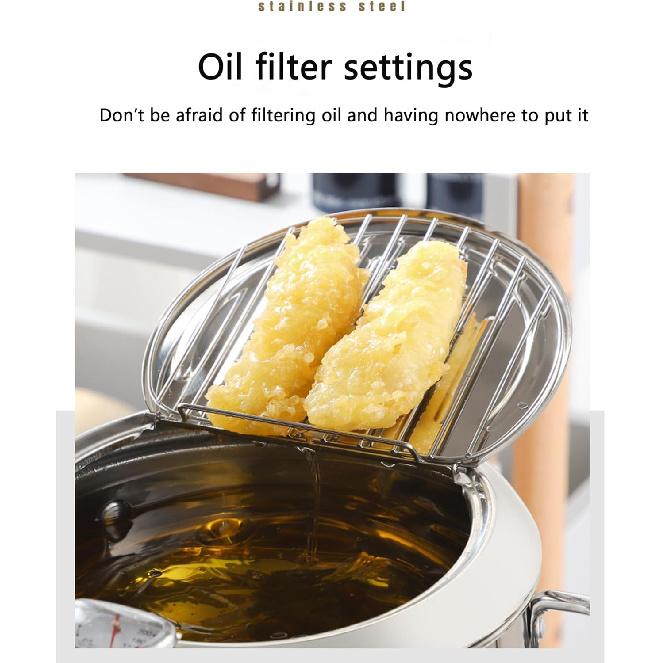 ФРИТЮРНИЦА ИЗ НЕРЖАВЕЮЩЕЙ СТАЛИ 304-Превосходный материал - нержавеющая сталь 304, прочный и безопасный, подходит для жарки картофеля фри, куриных наггетсов, колец кальмара, темпуры, креветок, картофельных чипсов, арахиса, рыбы, жареного тыквенного пирога и т. д.. Его можно использовать ежедневно или когда принимаете гостей. Подходит для семейных пикников или кемпинга.