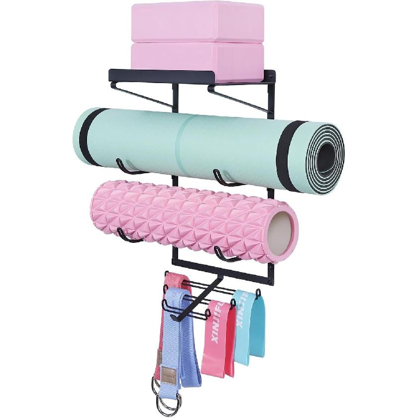 Настенный держатель для коврика для йоги Стойка для хранения коврика для йоги Аксессуары для домашнего спортзала с 3 секциями и 7 крючками для подвешивания ролика для массажа и эспандеров