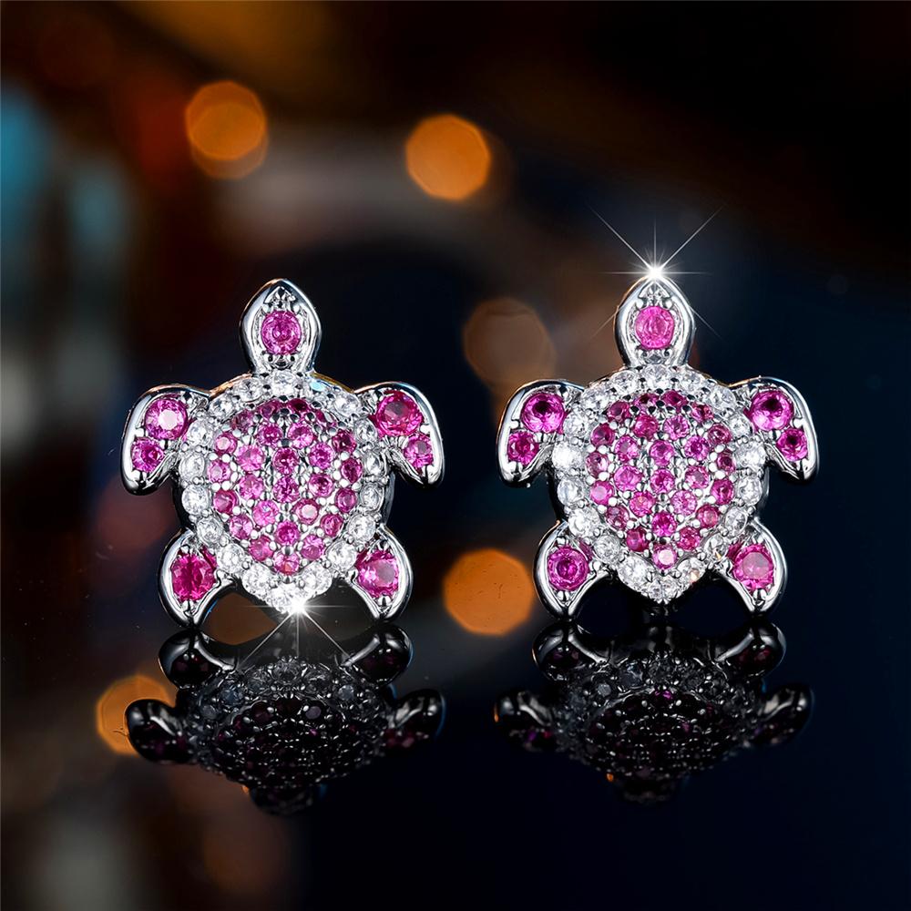 Cute Female Green Rose Red Blue Zircon Stone Small Round Turtle Stud Earrings Vintage Silver Color Wedding Jewelry For Women