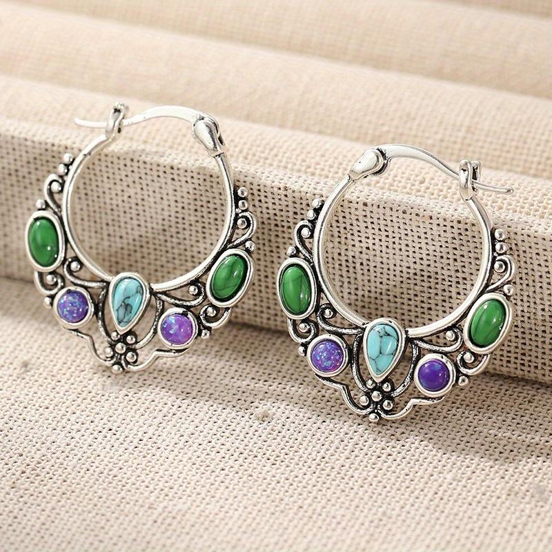 Серьги-кольца в богемном стиле с инкрустацией синтетической бирюзой, женские, винтажные, с серебристым покрытием, для банкета, праздничные, ювелирные аксессуары