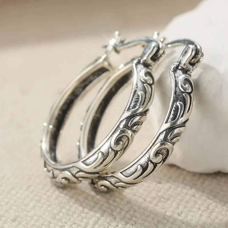 Винтажные серьги-кольца с рельефным узором в виде свитков с серебристым покрытием для женщин, классические элегантные ювелирные аксессуары, идеальный подарок на праздник