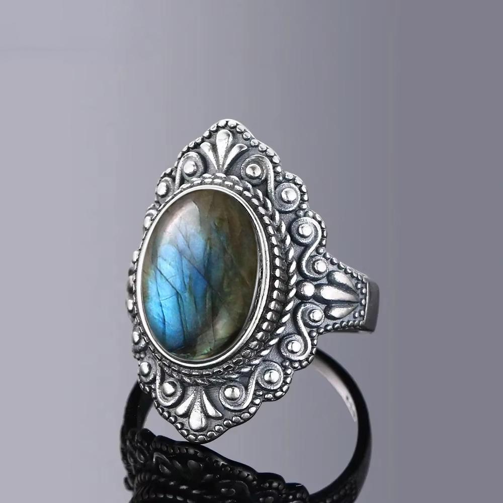 Винтажное Серебряное Кольцо Овальное Натуральный Лабрадорит Кольца На Палец Ретро Черный Оникс Тонкие Ювелирные Изделия Вечеринка Для Женщин Мужчин