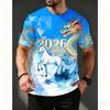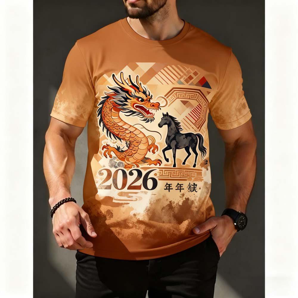 Мужская футболка на Новый год 2026 с принтом дракона и лошади, коричневый градиент, повседневная футболка с текстом благословения