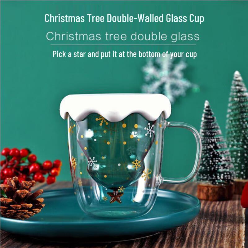 IMVE Double-Layer Insulated Christmas Glass Coffee Cup with Lid