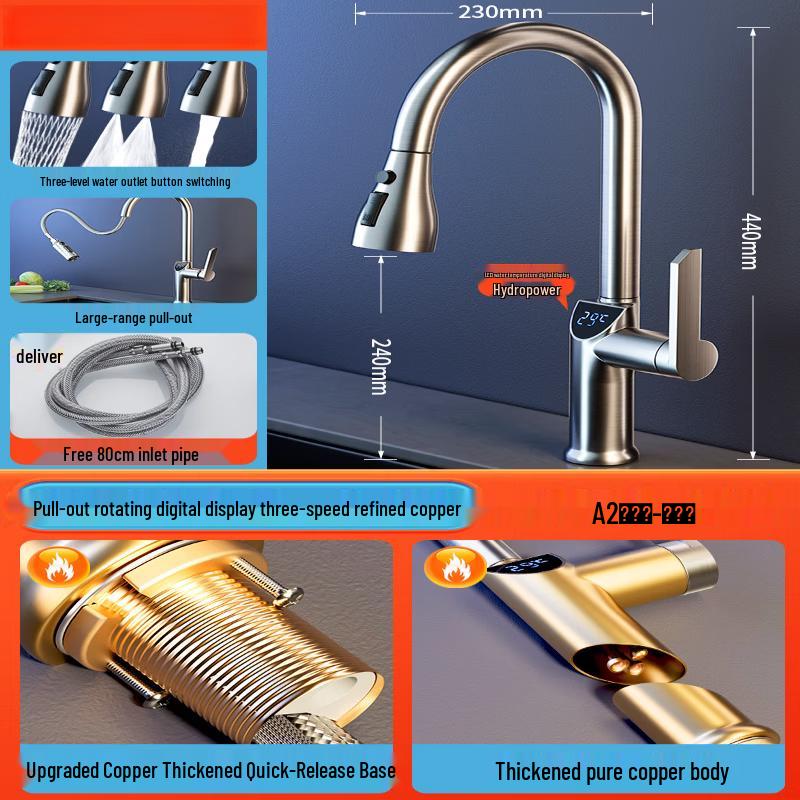 Brass Pull-Out Kitchen Faucet with Digital Display — купить товар онлайн с бесплатной доставкой по всему миру!