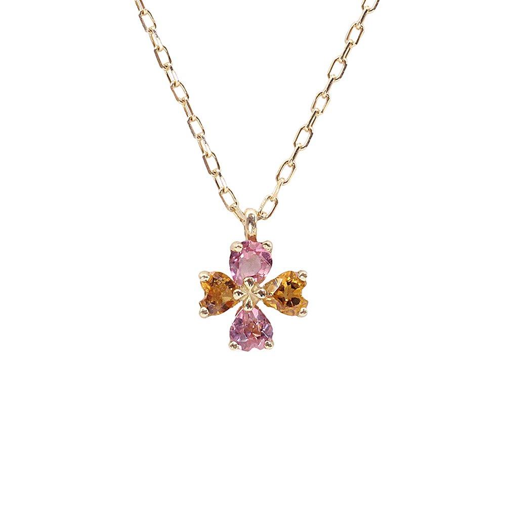 [Comment] This four-leaf clover necklace features a cute design of four hearts. The four-leaf clover is said to represent fame, wealth, health, and true love. Pink tourmaline is said to attract and sustain love and heal emotional wounds, while citrine is said to brighten and positively change the mood. This clover necklace, with its wonderful meaning, makes a wonderful gift for yourself or someone special.