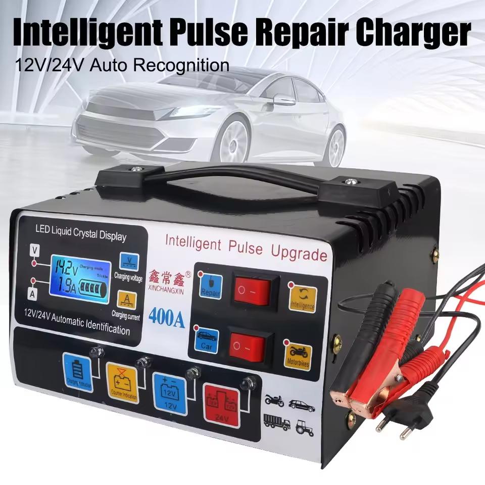 12V/24V 400A Car Battery Charger 220W High Power Fully Automatic Pulse Repair Smart LCD Display Self-stop Battery Fast Charger