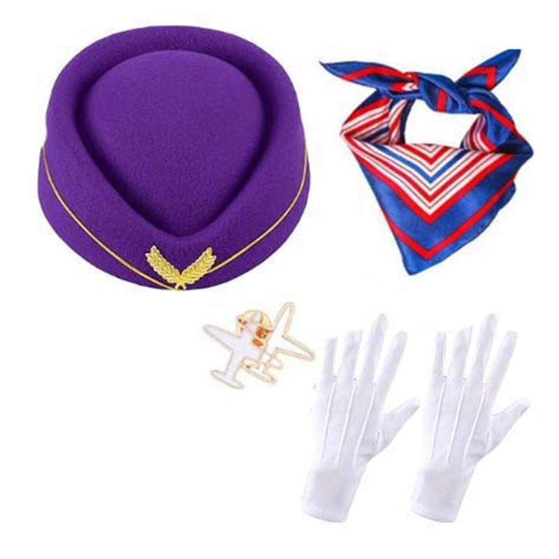Аксессуары бортпроводника, вы получите 1 женскую шляпу бортпроводника, 1 шарф, 1 пару белых перчаток бортпроводника, 1 значок в виде самолета, хороший набор для украшения себя на косплей и вечеринку на Хэллоуин