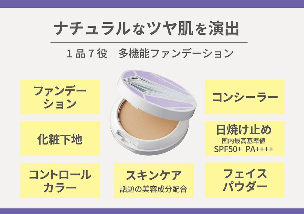Easily cover pores and dullness with a single application. This powdery foundation creates a poreless, radiant, and smooth complexion that appears to glow from within. In addition to its high sun protection of SPF50+ and PA++++, it also contains UV-sensitive beauty ingredients. This six-in-one foundation serves as a primer, color control, concealer, foundation, and sunscreen, allowing you to complete your base makeup routine after skincare. It's convenient yet resistant to sweat and sebum, ensuring lasting results! No cleanser is required; simply wash it off with your regular face wash.