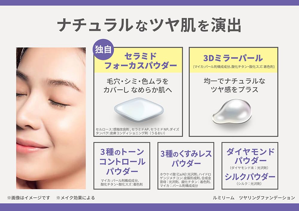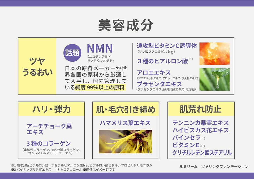 Ethylhexyl Methoxycinnamate, (Dimethicone/Vinyl Dimethicone) Crosspolymer, Nylon-12, Synthetic Phlogopite Iron, Silica, Dimethicone, Synthetic Phlogopite, Boron Nitride, Diphenylsiloxyphenyl Trimethicone, Magnesium Myristate, Nicotinamide Mononucleotide, Ascorbyl Tetrahexyldecanoate, DNA, Placenta Extract, yeast fermented extract, brown sugar, ascorbyl phosphate Mg, hydrolyzed collagen, water-soluble collagen, succinyl atelocollagen, hydrolyzed hyaluronic acid, acetyl hyaluronic acid Na, hyaluronic acid hydroxypropyltrimonium, Tenninka fruit extract, hibiscus flower extract, pineapple fruit extract, jamelis leaf extract, Ar Chickweed leaf extract, aloe vera leaf extract, chlorella extract, kudzu root extract, tocopherol, stearyl glycyrrhetinate, ceramide AP, ceramide NP, soy protein, lauroyl lysine, diamond powder, silk, borosilicate (Ca/Al), tri(caprylic acid/capric acid)glyceryl, lauroyl glutamate di(phytosulfate) (Vinyl Dimethicone/Octyldodecyl), Acrylates Copolymer, Dimethyl Silylated Silica, Hydrogen Dimethicone, Trimethylsiloxysilicate, Stearic Acid, (Vinyl Dimethicone/Methicone Silsesquioxane) Crosspolymer, (Acrylates/Ethylhexyl Acrylate) Crosspolymer, Cellulose, etc.