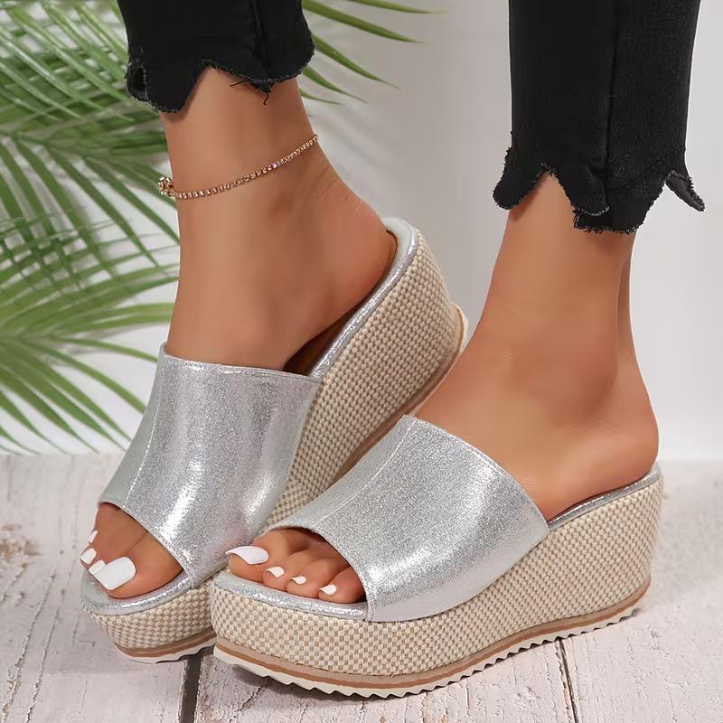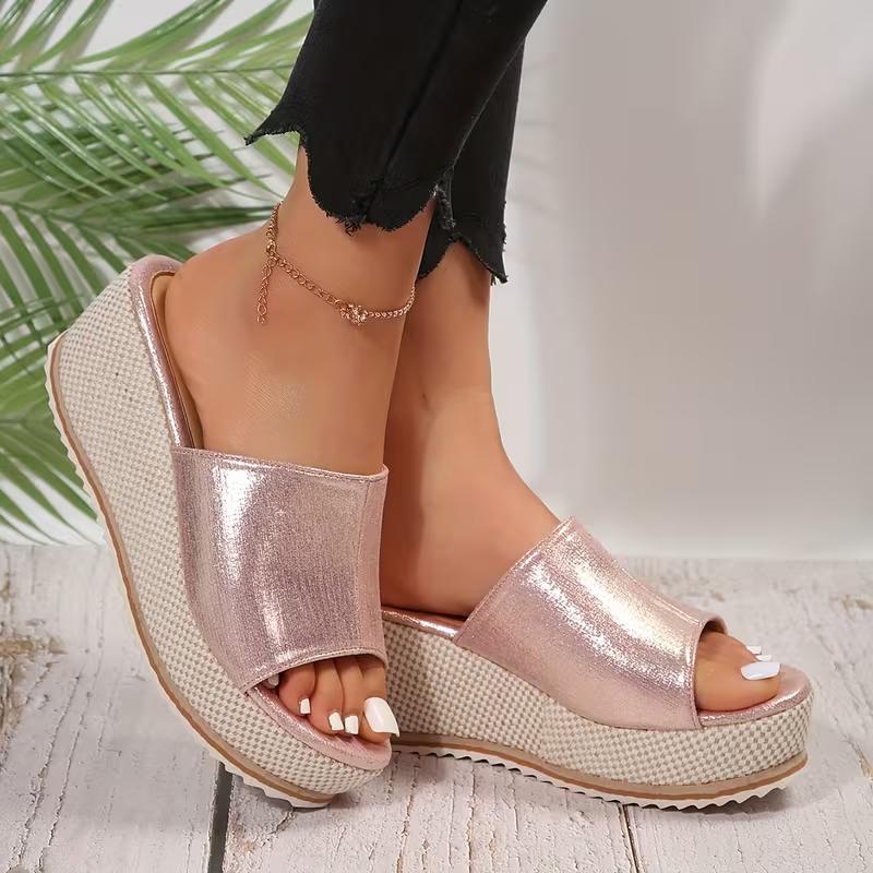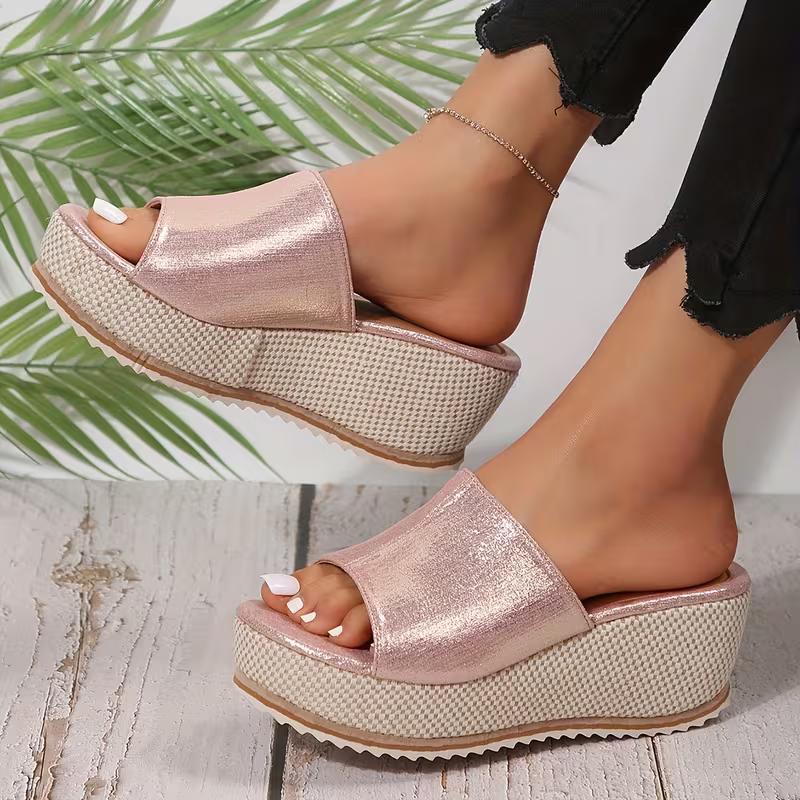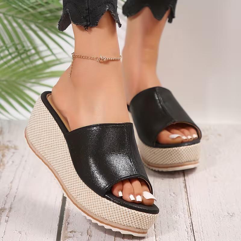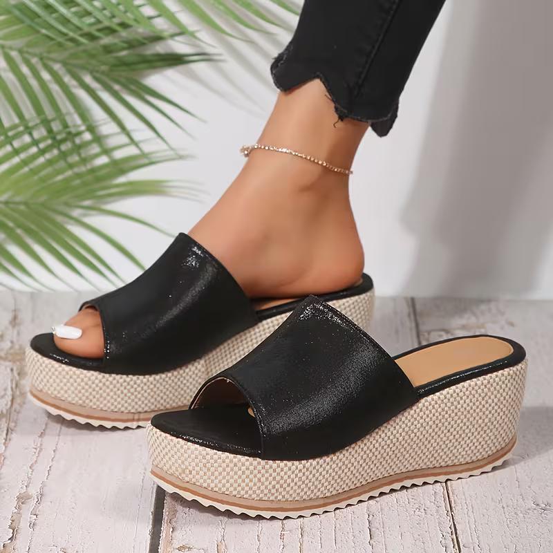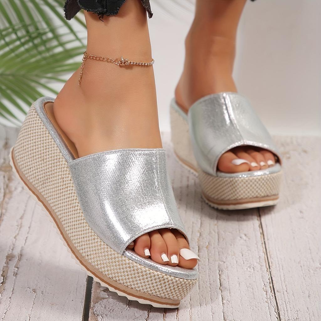 Новый стиль танкетка толстая подошва большого размера тапочки для женщин, модная плетеная подошва, европейские и американские мамины тапочки на одно слово в римском стиле