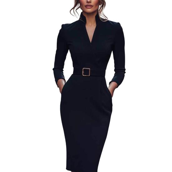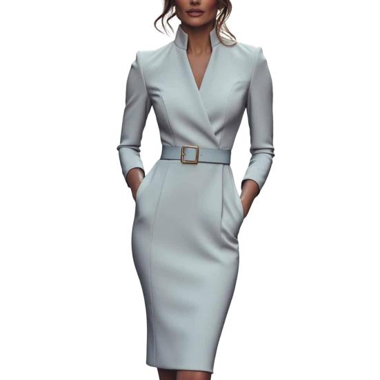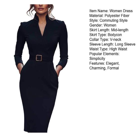 Элегантное женское платье: Подчеркните свой стиль этим высококачественным женским платьем, изготовленным из премиальных тканей, которые обеспечивают свежий, стильный вид.. Ткань не мнется, красиво драпируется и приятна на ощупь, что делает ее идеальной для формальных или деловых мероприятий.. Это платье классического дизайна с V-образным вырезом и поясом, подчеркивающим талию, выгодно подчеркивает фигуру и добавляет нотку изысканности..