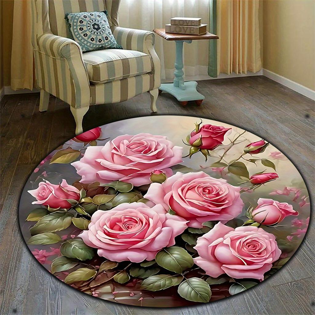 1 шт. Элегантный круглый коврик с розовой тематикой, моющийся полиэстеровый коврик для пола с пышным цветочным дизайном для гостиной, спальни, кухни
