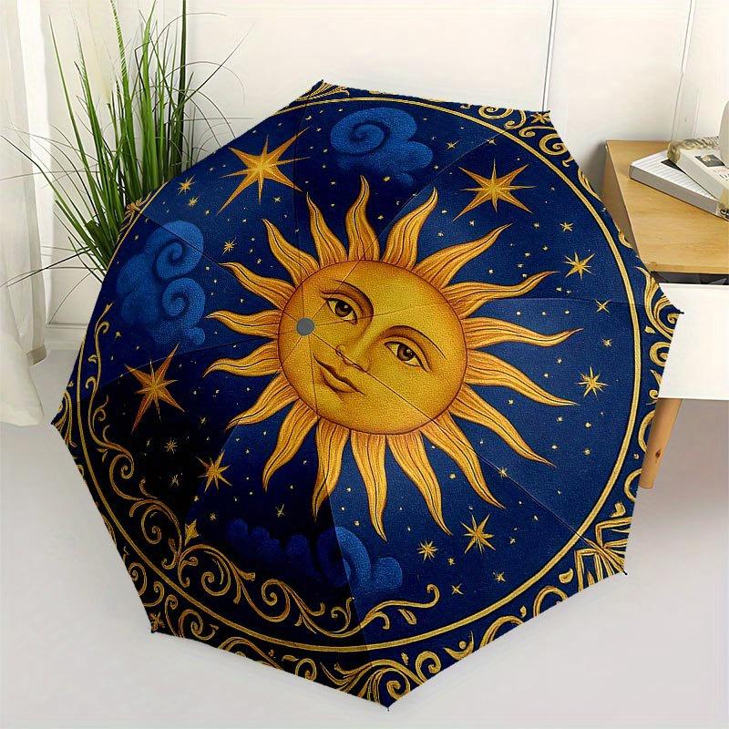 Golden Sun and Stars Circular Wall Art Decor Umbrella, Portable 3-Fold Compact Umbrella for Men & Women R133