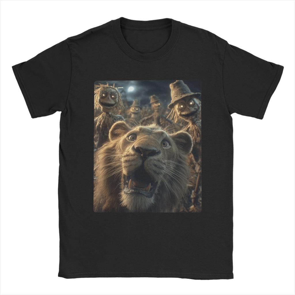 Men T-Shirts Funny Lion Selfie With Scarecrows Novelty Cotton Tee Shirt Scary Halloween T Shirt Crewneck merchandise Plus Size