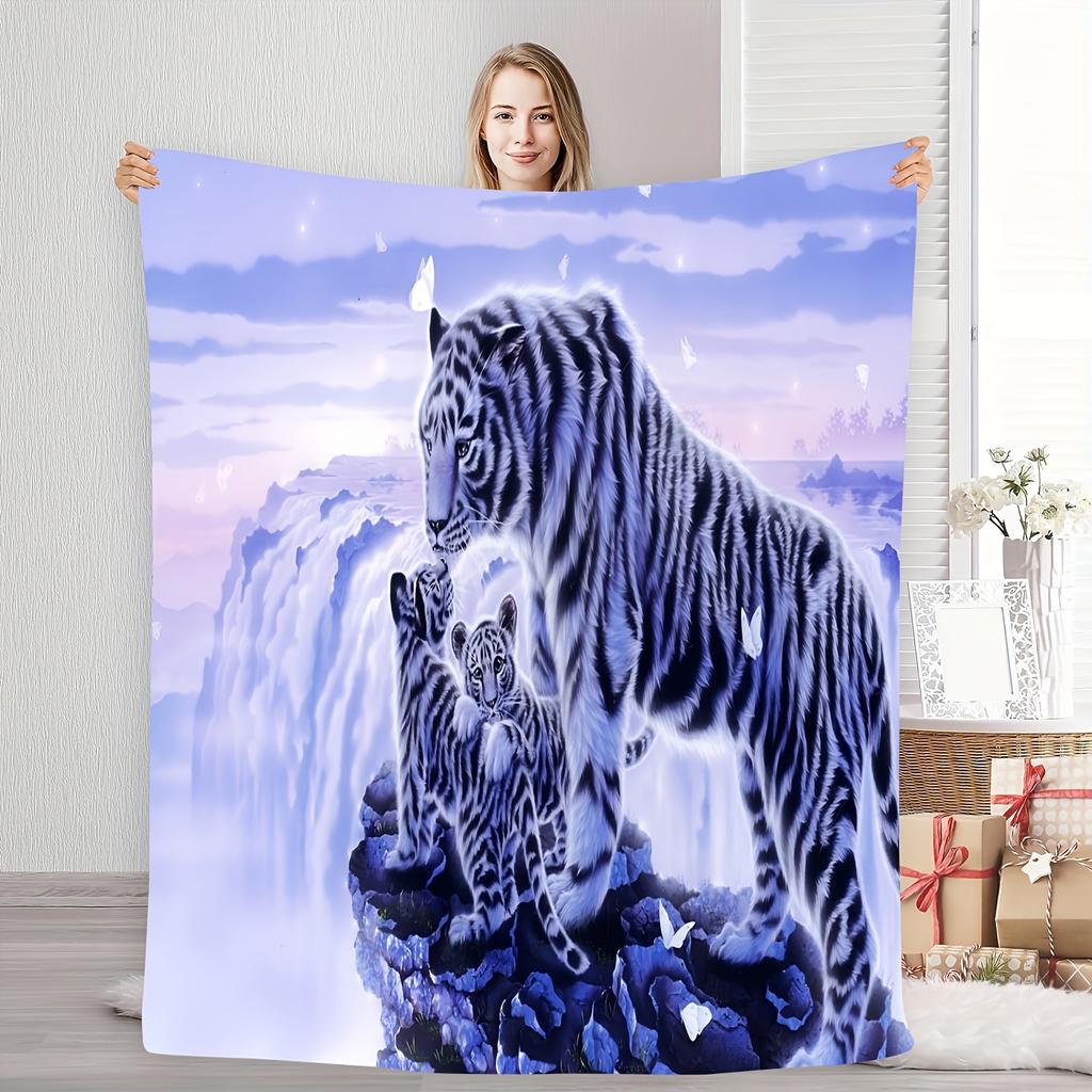 1pc Cozy White Tiger Print Blanket - Soft & Warm Flannel, 100% Polyester, Machine Washable, Perfect for Naps, Camping, Travel, O