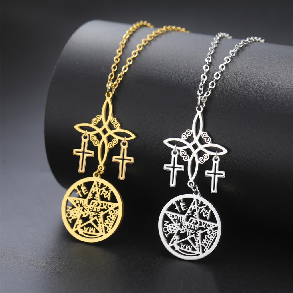 Triple Protection Necklace Cross Witch Knot Pentacle Tetragrammaton Stainless Steel Double Side Amulet Jewelry
